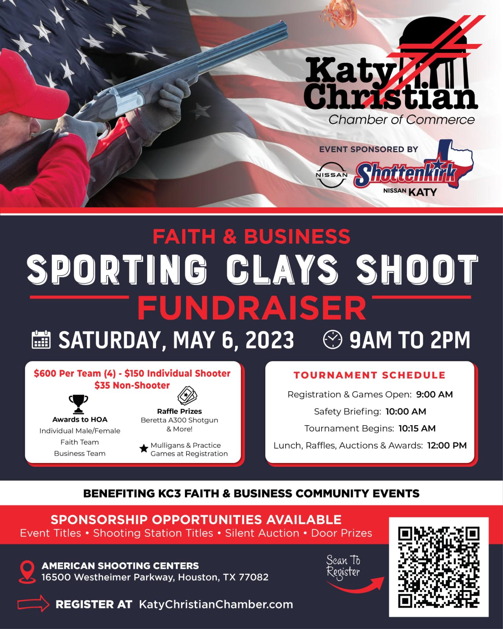 DESCRIPTION:Shottenkirk Nissan of Katy presents the KC3 "inaugural" Faith & Business Clay Shoot benefiting the Katy Christian Chamber of Commerce organization in its mission to keep faith in the workplace and town square. This event is encouraging our faith and business community to come together in fellowship and FUN! Please join us and register to reserve your team and companion tickets today. Invoicing available. Sporting clays is an exciting game that involves shooting clay targets at multiple stations. Shoot as many targets as possible at each station allowing for the highest possible score. Often referred to as golf with a shotgun\, sporting clays is quick moving\, super fun way to team build and network with local businesses\, churches\, charities\, vendors\, sponsors. Awards for highest overall - individual (male/female)\, Faith Team\, and Business Team. This "come as you are" red\, white and "boots" event will feature music\, hot lunch\, raffles\, games\, door prizes\, networking and more!